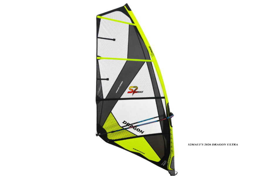 strongest high performance 4-batten wavesail and further improves upon the popular 2025 model which received rave reviews from all that experienced it. Starting with the original S2Maui DRAGON, which for a long time has led the industry in the lightest/strongest/high perf category, the DRAGON ULTRA reduces weight to a level 25-30% lighter than industry standard. At only 85g/square meter and featuring a 100% Dyneema™(High Modulus Polyethylene, world’s strongest fiber) woven core, S2Maui’s ULTRA-HMPE™ is the absolute lightest and most tear resistant sail cloth currently available for windsurf sail construction. The 2026 models incorporate 2 brand new materials, Carbon 2XD in the clew to further reduce weight and the extra-durable Ultra-HMPE™ ”Hot Yellow” in the foot panel.