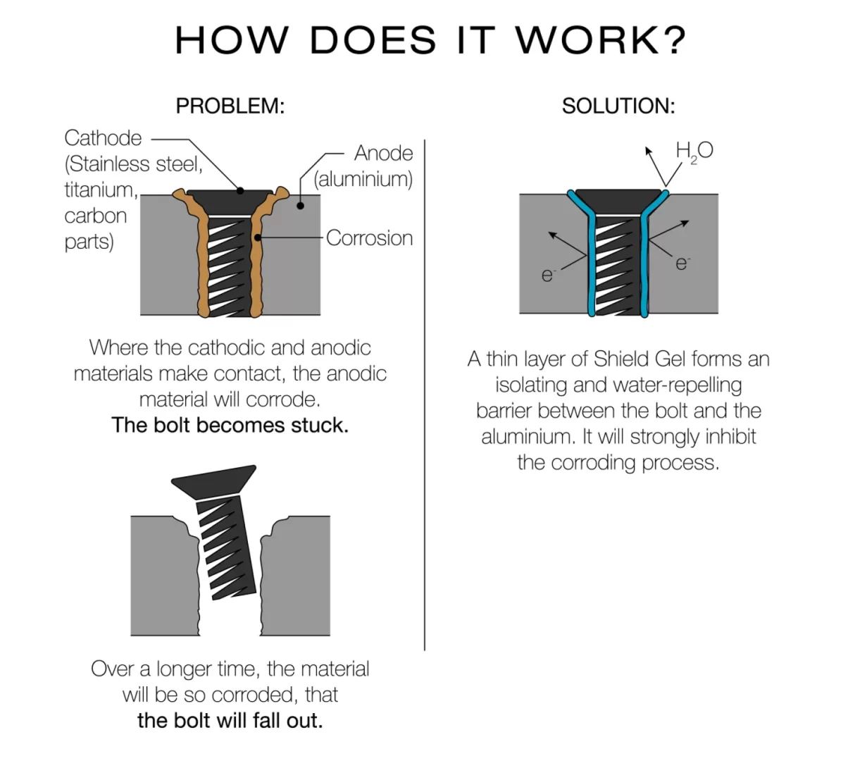 Isolating and water-repelling properties of the Shield Gel create a barrier between bolts and the aluminum, inhibiting the corroding process.